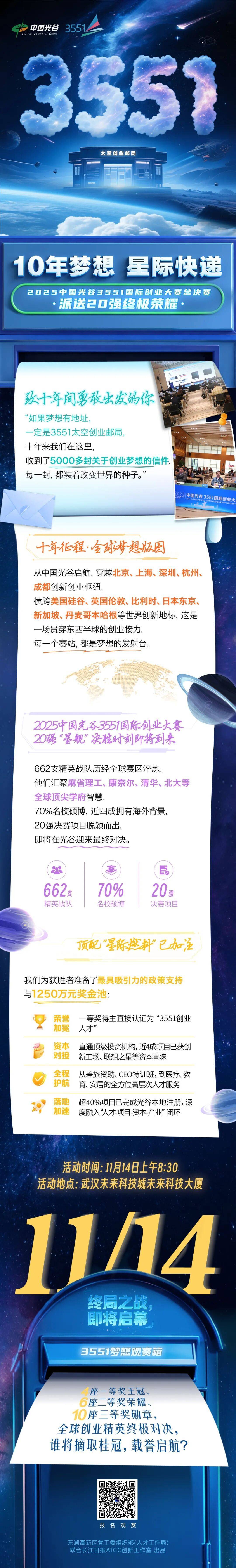 湖北日报讯(通讯员 董新才)11月14日上午8时30分,2025中国光谷3551国际创业大赛决赛将在武汉未来科技城未来科技大厦二楼多功能厅举行。来自麻省理工、康奈尔、清华、北大等世界知名大学的优秀企业家将在比赛舞台上追逐梦想。 4个一等桂冠、6个二等奖、10个三等奖牌、1250万元奖金等你来拿!全球商界精英秀最终,谁将摘得桂冠,扬名立万? 2025中国光谷3551国际创业大赛自今年5月启动报名以来,已收到662名国内外创业者报名。与往年相比,项目数量大幅增加。超过三分之一的人有国外背景和博士学位。大量外地和外资项目的涌入,悄然勾勒出光谷产业的磁力轮廓。从人工智能赋能千行百业,到生命科技守护健康,从绿色能源可持续发展,到开辟虚拟宇宙新维度……十年来,3551航天创业邮局收到5000余封充满梦想的创业信,光谷落地项目400个,培育了4家专精特新企业、20家瞪羚企业。近五年来,已有22家企业获得股权融资,融资金额近20亿元。