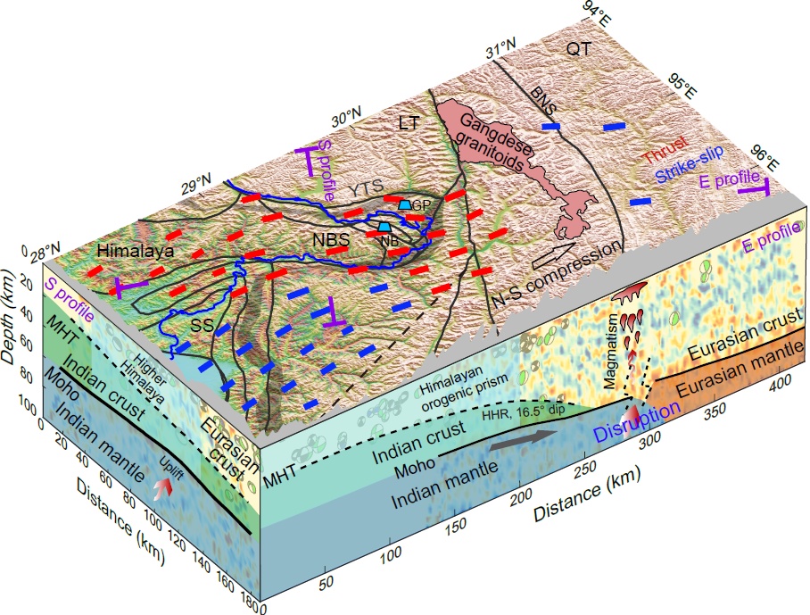 喜马拉雅山是如何不断上升的?为什么东部地区经常发生强震?我国研究人员的最新研究首次揭示了喜马拉雅东部地区地震活动的主要控制机制,为认识这一全球典型造山带的地震危险性和增加过程提供了新的视角。喜马拉雅山脉是印度板块和欧亚板块碰撞形成的。一段时间以来,科学家们对中部地区的地震机制有了较为清晰的认识,但对地质结构更为复杂的东部地区的认识仍然有限。中国科学院青藏高原研究所的一项研究首次揭示,青藏高原下方的印度板块以低角度、特殊的“斜坡型”断裂结构主导了喜马拉雅山东端的地震活动和隆起过程。结果它最近发表在学术期刊《国家科学评论》上。研究团队通过在喜马拉雅山东端布置密集的地震台站,获得了高质量的连续地震波形数据。分析发现,印度板块的莫霍面(地壳与地幔的界面)在这里并不是高角度侵入,而是在拉萨地体下方以缓坡向北延伸,形成了独特的低角度低角度格局。 “印度的地壳就像一台大推土机,以小角度进入喜马拉雅山下面。”论文第一作者、中科院青藏高原研究所研究员白灵进行了讲解。 “同时,印度地壳顶部的主要喜马拉雅逆冲断层呈‘斜坡’形状,两者共同构成控制该地区构造运动的主要系统。”研究还发现该地区应力场主要表现为强北向- 南向水平挤压,导致地壳能量不断积累并通过地震释放。这种构造格局与尼泊尔喜马拉雅山相似,但与喜马拉雅山西部和缅甸山弧的深俯冲特征明显不同。这一发现不仅揭示了喜马拉雅东部地区的地震活动特征,而且为认识整个喜马拉雅造山带的地震破坏和机械隆升行为提供了新的视角。论文共同通讯作者李鸿儒表示:“接下来我们将聚焦整个喜马拉雅山的大尺度构造系统,深入揭示大陆碰撞如何控制地震孕育和高原生长。”图为印度板块在喜马拉雅山脉东部的低角度俯冲、喜马拉雅主逆冲断层的斜坡结构以及近南北向的水平挤压地震应力场分布离子模型。 。通过对喜马拉雅山地下结构的深入了解,科研人员可以更加准确地评估该地区的地震危险性,为防灾减灾提供科学依据。 (记者胡哲)
